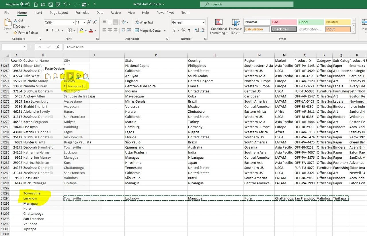 Then we can right-click and select ‘Transpose’. Now you’ve put your cells in a column.